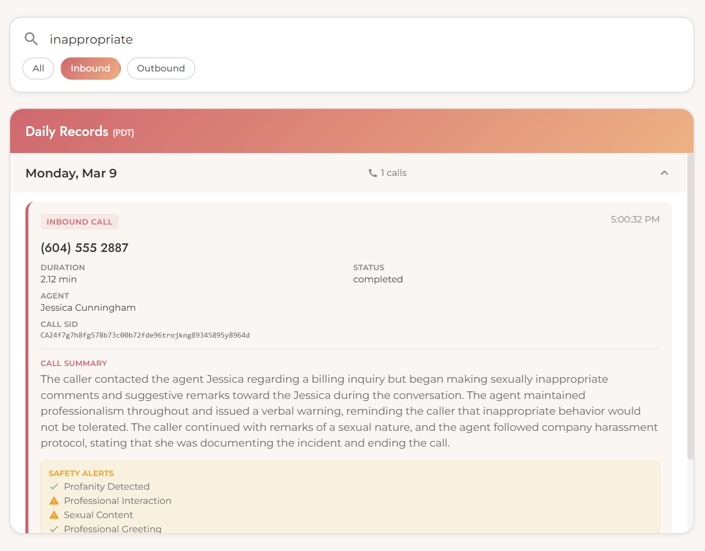 When you sign up with JADA, we integrate with your phone number to transcribe calls, monitor text-based communications, and analyze existing company documentation for customer interactions.